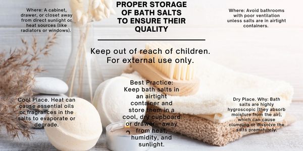 Proper storage of bath salts is crucial to preserve their quality. Here's why: Cool Place. Heat can cause essential oils or fragrances in the salts to evaporate or degrade. Where: A cabinet, drawer, or closet away from direct sunlight or heat sources (like radiators or windows). Dry Place. Why: Bath salts are highly hygroscopic (they absorb moisture from the air), which can cause clumping or dissolve the salts prematurely. Where: Avoid bathrooms with poor ventilation unless salts are in airtight containers. Best Practice: Keep bath salts in an airtight container and store them in a cool, dry cupboard or drawer—away from heat, humidity, and sunlight.